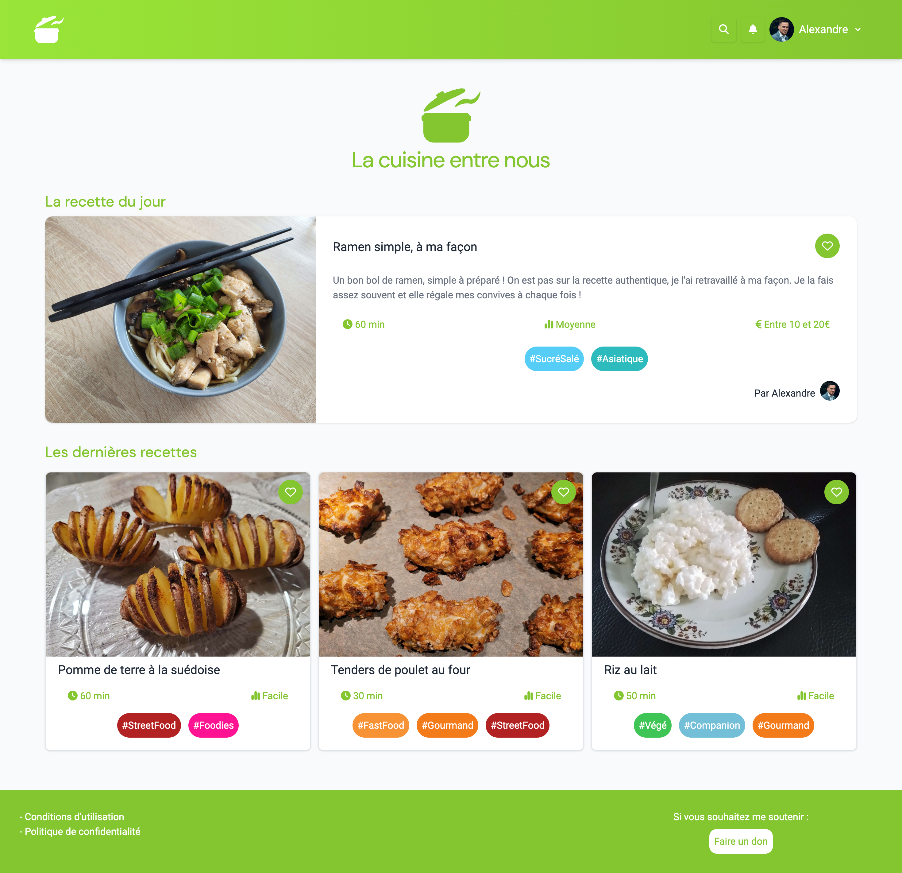 Un site que j'ai créé, que je maintiens et que je gère au quotidien. La cuisine entre nous est un endroit de partage, où chacun peut y déposer ses recettes. Gratuit, sans pub et sans trackers, cette plateforme n'a de but que l'amour de la cuisine.